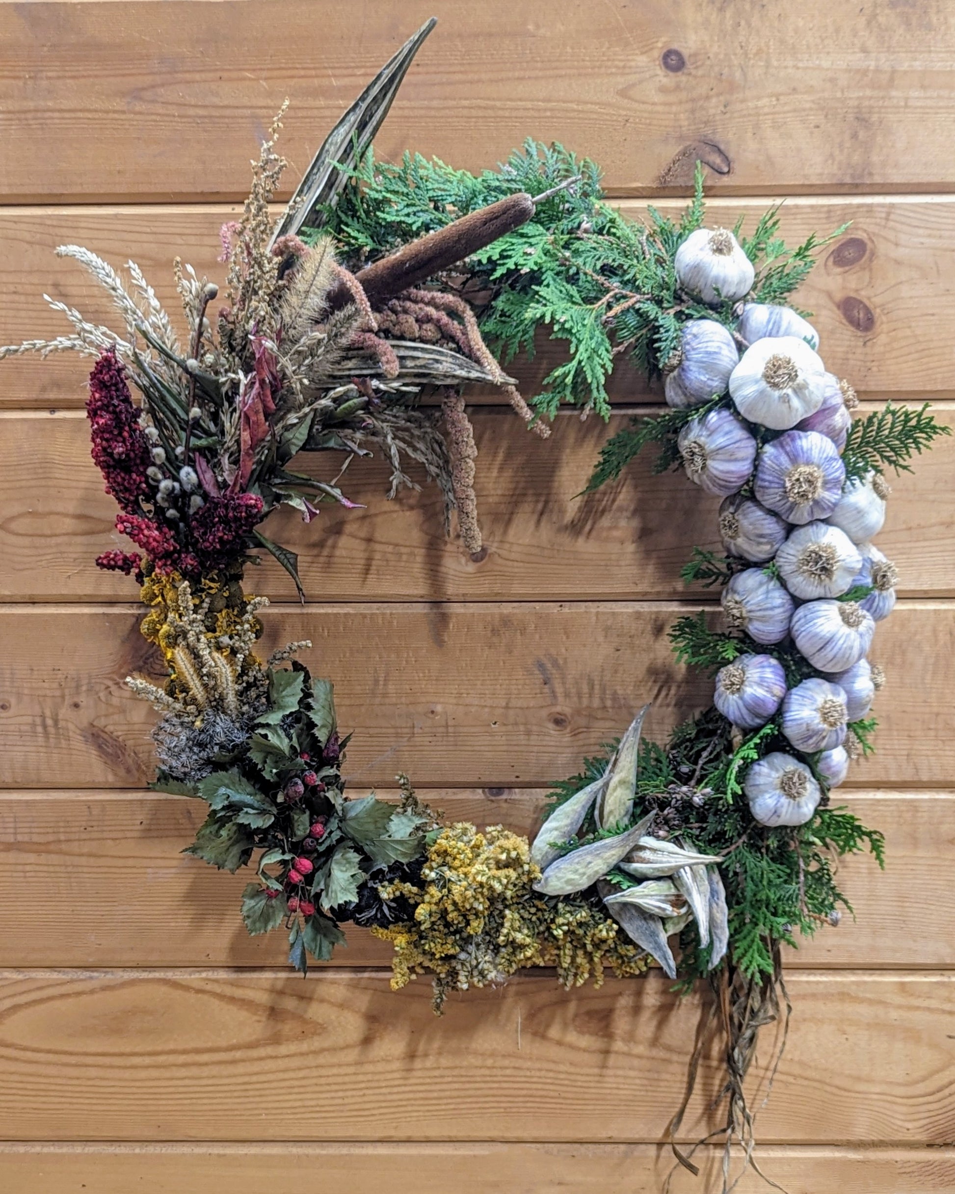 Our Garlic Holiday Wreath is handmade using 18 organically grown Chesnok Red culinary garlic bulbs and foraged ornamentals from our small family farm including: sumac, cattail, goldenrod, black eyed susans, sneezeweed, corn tassels, okra, amaranth, milkweed, hawthorn, lambsquarters, pussy willow, Queen Anne's lace, cedar garland and various grasses.